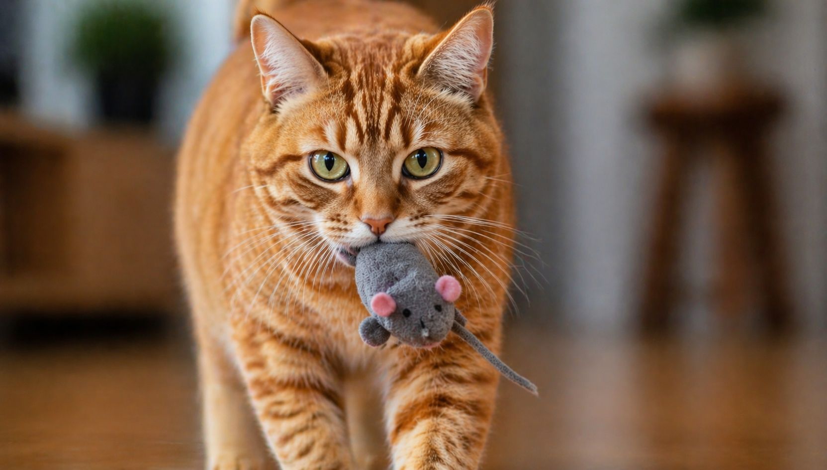 A stuffed mouse, a feather wand, or even a sock can become a substitute for real prey. Your cat stalks it, captures it, and then delivers it to you as if it were the real thing.